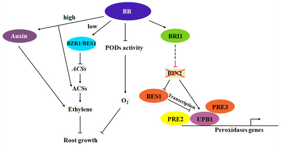 The det2-9 mutant, which is defective in BR synthesis, exhibits a short-root phenotype. The short-root phenotype of the det2-9 mutant can be partially rescued by det2-9/acs9 double mutant and det2-9/ein3/eil1-1 triple mutant, which are defective in ethylene synthesis and signaling, respectively. Unlike BR’s role in stabilizing ACS proteins to induce ethylene biosynthesis, research has found that BR signaling transcription factors BES1 and BZR1 can directly bind to the promoter regions of the ACS7, ACS9, and ACS11 genes to suppress their expression, indicating a natural regulatory mechanism at physiological BR levels. Additionally, compared to the wild type, the det2-9 mutant exhibits the excessive accumulation of superoxide anions, and increased levels of superoxide anions inhibit root growth. BR controls superoxide anion accumulation mainly through the peroxidase pathway rather than the NADPH oxidase pathway. This study reveals the hormonal cross-regulation among BR, ethylene, and ROS in controlling root growth and development in Arabidopsis [89]. Moreover, in the absence of BR, BIN2 phosphorylates UPB1, promoting UPB1 protein stability and transcriptional activity and enhancing UPB1’s regulation of downstream genes, thereby negatively regulating root meristem development. When BR is perceived, BIN2 activity is inhibited, and BES1 regulates UPB1 expression at the transcriptional level, promoting root meristem development [90]. HD-ZIP III class transcription factors positively regulate BR biosynthesis-related genes in vascular tissues. Genetic and physiological analyses of HD-ZIP III mutants and BR biosynthesis genes indicate that BR biosynthesis regulated by HD-ZIP III is a key factor in inhibiting periclinal cell division around vascular cells. BR induces the division of vascular cells in RAM by inhibiting cytokinin responses [91] (Figure 4).