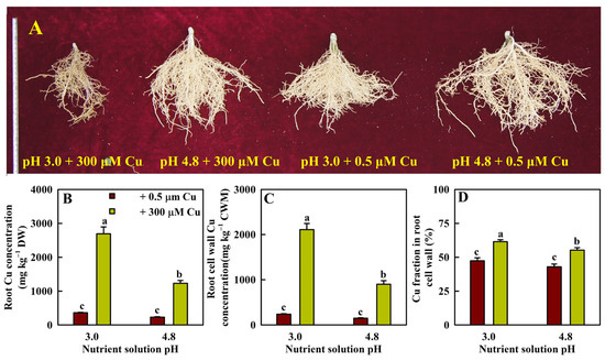 Impacts of Cu–pH interactions on root growth (A), as well as the mean (±SE, n = 4) Cu concentrations in roots (B) and root CWs (C) and Cu fraction in root CWs (D). Different letters above the bars indicate a significant difference at p < 0.05.