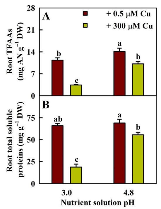 Cu toxicity reduced the levels of TFAAs and TSPs in roots by 70% and 71%, respectively, at pH 3.0 and by 28% and 19%, respectively, at pH 4.8 (Figure 2).