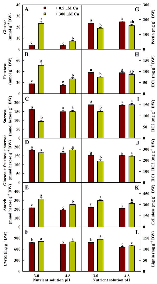 Impacts of Cu–pH interactions on the mean (±SE, n = 4) concentrations of glucose (A), fructose (B), sucrose (C), glucose + fructose + sucrose (D), starch (E), CWMs (F), pectin (G), HC1 (H), HC2 (I), HC1 + HC2 (J), cellulose (K), and lignin (L) in roots. HC1, hemicellulose 1; HC2, hemicellulose 2. Different letters above the bars indicate a significant difference at p < 0.05.