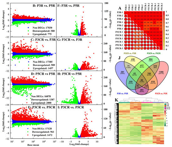Pearson correlation coefficient (r) matrix for P3R, P5R, P3CR, and P5CR (A), as well as MA maps (B–E), volcano plots (F–I), Venn diagram (J), and HCA (K) of DEGs identified in R3R vs. P5R, P3CR vs. P3R, P5CR vs. P5R, and P3CR vs. P5CR.