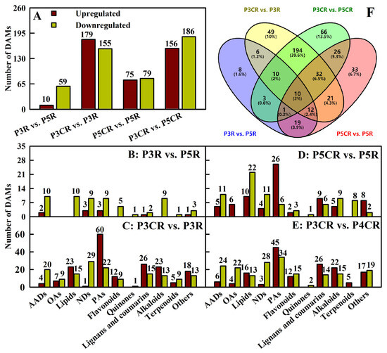 Upregulated and downregulated metabolites (A–E) and Venn diagram of DAMs (F) detected in P3R vs. P5R, P3CR vs. P3R, P5CR vs. P5R, and P3CR vs. P5CR.