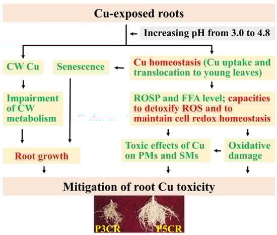 Plant Cu tolerance heavily depends on soil acidity (pH) because soil Cu levels decrease with increasing pH [14]. In acidic soils, rhizosphere alkalization induced by roots leads to a decrease in Cu bioavailability, thus reducing plant exposure to Cu [5]. A high pH in the growth matrix can lessen the inhibition of plant growth induced by Cu toxicity [1,7]. Nonetheless, most related studies have focused on investigating the effects of Cu–pH interactions on plant growth; water and nutrient uptake; root exudates and architecture; photosynthesis, pigments, CW components (CWCs), and nonstructural carbohydrates (NCs) in leaves; and hormones and reactive oxygen species (ROS) formation and detoxification in leaves and roots [1,2,15,16].