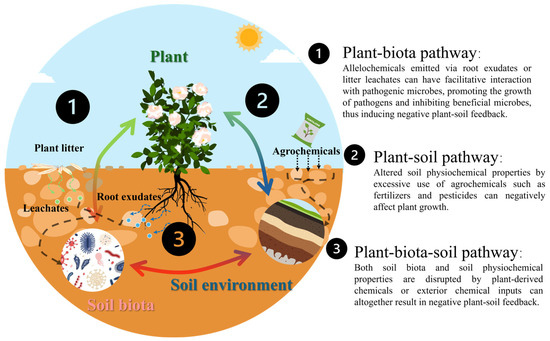 Three pathways of plant-soil feedback based on the description of Frouz [109]: 1. Plant-biota pathway; 2. plant-soil pathway; and 3. plant-biota-soil pathway. Dashed line indicates the direct effect from root exudates or leachates to soil biota and agrochemicals to soil physiochemical properties. The solid line indicates the interactions among plant, soil biota, and soil environment.