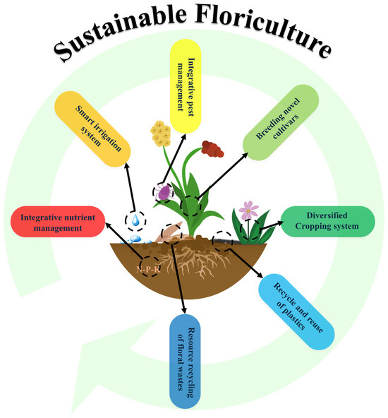Multiple practices are listed below that can be implemented to achieve soil health in the development of floriculture sustainability, from cultivar breeding to recycling of flower wastes (illustrated in Figure 3).