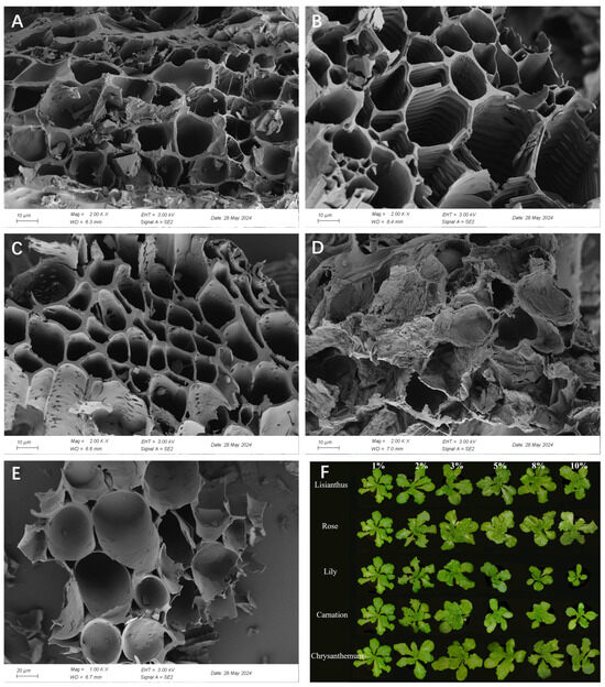 Scanning Electron Micrograph of biochar derived from floral wastes (A) rose, (B) lily, (C) lisianthus, (D) chrysanthemum, (E) carnation, and (F) the effects of lettuce growth with their application (1,2,3,5,8,10% addition) in growth substrate.
