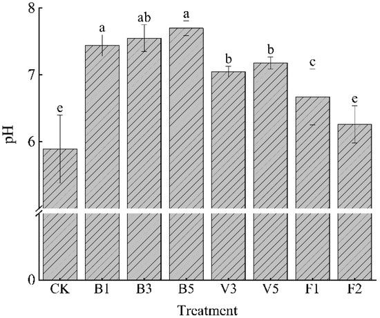 Effects of different soil amendments on soil pH. Note: CK: control condition, B1: 1% biochar, B3: 3% biochar, B5: 5% biochar, V3: 3% vermicompost, V5: 5% vermicompost, F1: 0.1% mineral-source potassium fulvic acid, F2: 0.2% mineral-source potassium fulvic acid; the means are not significantly different between soil type treatment (p > 0.05) when followed by the same lowercase letter, according to Duncan’s multiple range test; ANOVA, analysis of variance.