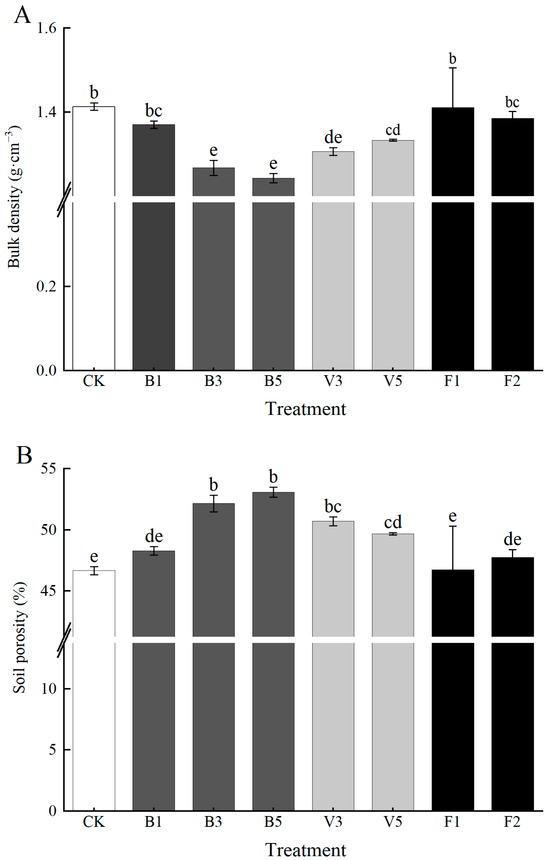 (A,B) Effects of different soil amendments on soil bulk density and porosity. Note: CK: control condition, B1: 1% biochar, B3: 3% biochar, B5: 5% biochar, V3: 3% vermicompost, V5: 5% vermicompost, F1: 0.1% mineral-source potassium fulvic acid, F2: 0.2% mineral-source potassium fulvic acid. The means are not significantly different between soil type treatment (p > 0.05) when followed by the same lowercase letter, according to Duncan’s multiple range test; ANOVA, analysis of variance.