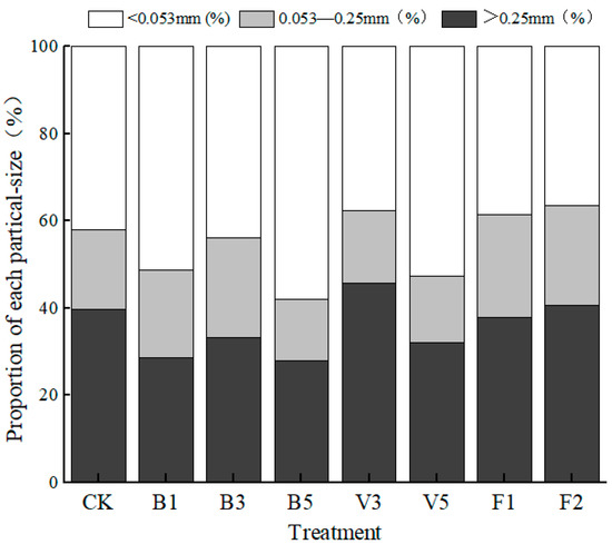 Soil aggregate is the basic unit of soil structure and the particle size distribution of aggregates is affected by the application of amendments. As can be seen from Figure 3, the content of the CK macroaggregates (particle size > 0.25 mm) is roughly the same as that of silky clay particles (particle size < 0.053 mm), which are 39.71% and 42.13%, respectively. Compared with the CK, the distribution of soil aggregates changed significantly in the treatment group, and the effects of different soil amendments were also different. Biochar treatment obviously increased the content of silt clay and decreased the content of macroaggregates. The content of B5 powder clay is the highest in all treatments (57.97%), with an increase of 37.60%; the content of B3 macroaggregates was the highest in the biochar treatment (33.35%). There were significant differences in the powder clay content of vermicompost treatment. Compared with the CK, the content of V3 decreased by 10.56%, while that of V5 increased by 24.78%. The powder clay content of F1 and F2 decreased by 8.33% and 13.17% compared with the CK, respectively. The contents of microaggregates (0.053~0.25 mm) increased significantly, which were 23.60% and 22.84%, respectively.
