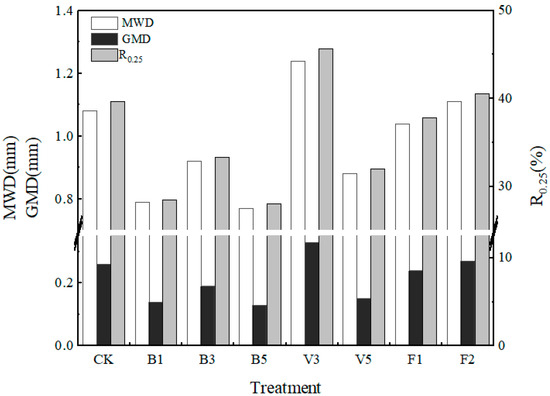 The aggregate mean weight diameter (MWD), geometric mean diameter (GMD), and water stability of large aggregate content (R0.25) are important indexes to characterize the stability of soil aggregates. The higher the value, the better the stability of soil aggregates. As shown in Figure 4, all stability indexes of biochar treatment are presented in the order of B3 > B1 > B5, in which all the stability indexes of B5 are the lowest values in all treatments. Compared with the CK, the stability indexes of V5 and F1 all decreased, and the MWD decreased by 18.52% and 3.70%, respectively; GMD decreased by 42.31% and 7.69%, respectively; and R0.25 decreased by 19.34% and 4.84%, respectively. Compared with the CK, the stability of V3 and F2 aggregates was significantly improved, among which the stability indexes of V3 were the highest, and MWD, GMD, and R0.25 were increased by 14.81%, 26.92%, and 15.08%, respectively, indicating that 3% vermicompost treatment had the best effect on the stability of soil aggregates.