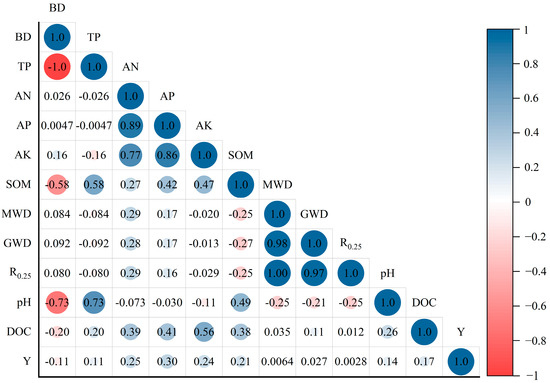 Heat map for correlation analysis of soil indicators. Note: BD: bulk density; TP: total porosity; AN: available-N; AP: available-P; AK: available-K; SOM: soil organic matter; MWD: mean weight diameter; GWD: geometric mean diameter; R0.25: water-stable large aggregate content; DOC: dissolved organic carbon; Y: yield. The numbers in the figure represent correlation coefficients, with a significance level of p < 0.05.