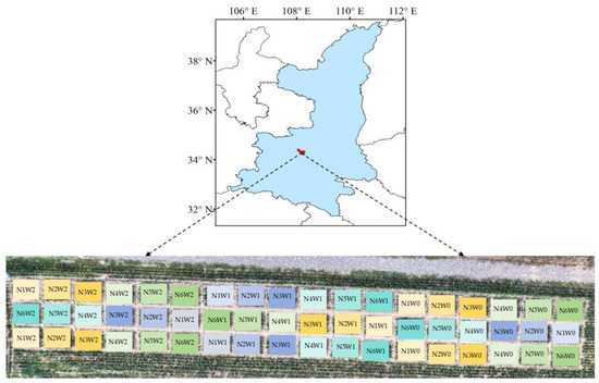 A total of 54 plots were set up in the test area, and three water treatments and six nitrogen treatments were set up. These included: rain-fed (W0), deficit irrigation (W1: 60–70% of field water holding capacity), and full irrigation (W2: 90–100% of field water-holding capacity); N1 (0 kg·ha−1), N2 (80 kg·ha−1), N3 (160 kg·ha−1), N4 (240 kg·ha−1), N5 (320 kg·ha−1), and N6 (400 kg·ha−1). These were applied twice in the whole growth period at the sowing (50%) and jointing stages (50%). The test plots are shown in Figure 1.