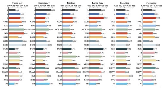 The importance of input features in different growth periods of summer maize is shown in Figure 4. Before inputting the data into the model, input feature analysis was carried out. The weights of the input data in different growth periods were all different. For example, in the jointing stage, the optimized soil-adjusted vegetation index (OSAVI) was 0.068, accounting for the largest proportion; however, in the flowering stage, it was only 0.041, accounting for a relatively small proportion. Similarly, the normalized difference vegetation index (NDI) was 0.071 in the three-leaf stage, accounting for the largest proportion; but in the flowering stage, it was only 0.046, accounting for the smallest proportion. The input feature analysis results of the added plant height (PH) data show that as an input variable, plant height showed relatively high proportions in the seedling emergence stage, flare opening stage, tasselling stage, and flowering stage of crops, which were 0.066, 0.063, 0.053, and 0.051, respectively, this being relatively high among all input variables in the corresponding periods. Thus, PH plays an important role in improving prediction accuracy. In other growth periods, plant height still has a positive effect on improving the accuracy of deep learning models.