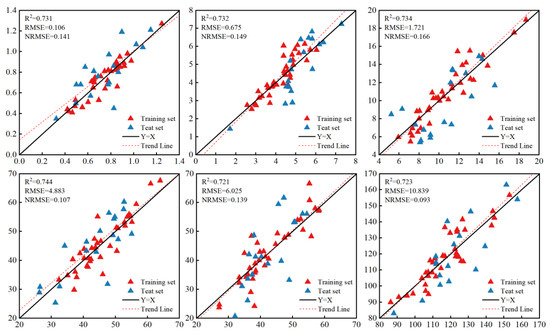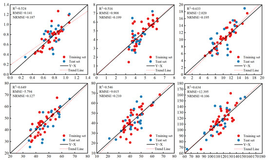 As shown in Table 2, among the three models, the PLSR model has the worst inversion effect when using CIS alone. The R2 and NRMSE are 0.323–0.401 and 0.142–0.256, respectively. The accuracy of biomass prediction using only a single-factor CIS is still poor.