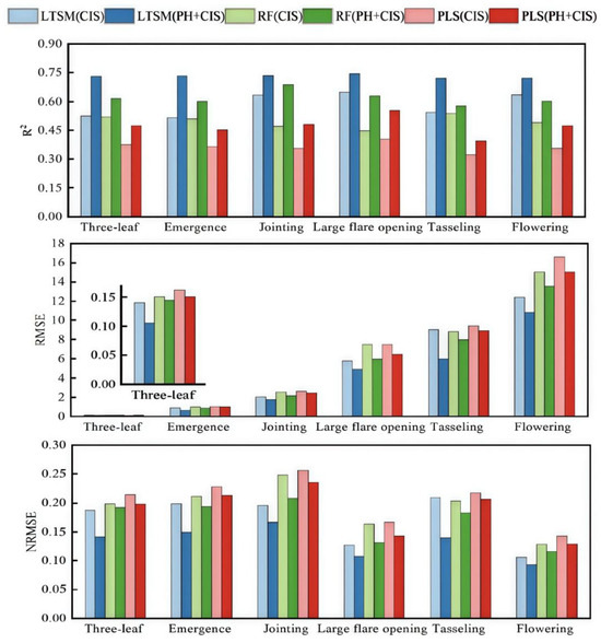 Comparison of the results of R2, RMSE, and NRMSE for the different models in different growth periods.
