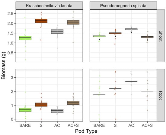 No herbicide applied: Root and shoot biomass for Krascheninnikovia lanata and Pseudoroegneria spicata with four different seed pod treatments (BARE = bare seed (control), S = soil alone, AC = activated carbon alone, AC + S = soil plus activated carbon) when herbicide was not applied. Boxplots are the model-predicted outcomes, and points are the actual raw values.