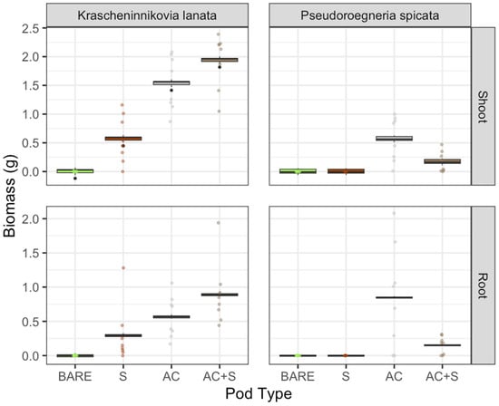 Herbicide applied: Root and shoot biomass for Krascheninnikovia lanata and Pseudoroegneria spicata with four different seed pod treatments (BARE = bare seed (control), S = soil alone, AC = activated carbon alone, AC + S = soil plus activated carbon). Boxplots are the model-predicted outcomes, and points are the actual raw values.