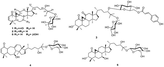 However, unlike sutherlandioside D, compound 1 does not have a hydroxymethine at C-7 but a methylene group. Additionally, an extra carbonyl group at C-11 was found to be linked to the protons at position 19. The chemical shifts of H-12 were detected in the lower field compared to the resonance of H-12 at δH 1.62 (H-12α) and δH 1.35 (H-12β) in compound 5, further confirming the second carbonyl group to be attached to C-11. A carbonyl group at position 11 indicates that compound 1 is also similar to sutherlandioside C [28]. However, unlike sutherlandioside C, compound 1 features a double bond between C-2 and C-3 instead of a hydroxyl group at C-3. Following the data from HRESIMS, IR, and NMR analyses, compound 1 has been characterised as 24S,25-dihydroxycycloart-2-en-1,11-dione-25-O-β-D-glucopyranoside (lessertioside A).