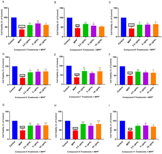 Following optimisation of the concentration to be used for the neuroprotection studies, the neuroprotective potentials of the compounds (3–11) were evaluated in the SH-SY5Y cells co-treated with compounds and MPP+. Figure 3 confirms that under the concentrations utilised, all compounds significantly increased the viability of SH-SY5Y cells following MPP+ toxicity except for the cells treated with compound 4 (Figure 3) at the 10 µg/mL concentration. Indeed, MPP+ reduced cell viability to about 37 to 48%, while treatment with concentrations of the compounds rescued the cells from MPP+ toxicity. Since the 2.5 µg/mL concentration for the majority of the compounds showed the most increased cell viability, this concentration was selected for further evaluation of the neuroprotective effects of the compounds.
