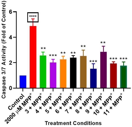 Apoptosis is a mechanism of cell death, and caspase 3/7 activities in the cells can indicate apoptosis. Thus, to investigate apoptosis in the cells, the activities of caspase 3/7 were measured using the Promega caspase assay kit in cells pre-treated with compounds before exposure to MPP+. The results showed that compounds 3–11 significantly mitigated the apoptosis-inducing effects of MPP+ by attenuating the elevated levels of caspase 3/7 activities in the cells. When caspase 3/7 activities were expressed as a fold of the control, which control cells set to 1, MPP+ increased caspase 3/7 activities to approximately 5-fold of the control while the compounds ranged from 1.5- to 2.8-fold of the control (Figure 5). It is important to highlight that compound 8 inhibited apoptosis the most to about 1.5-fold of the control. These results suggest that the studied compounds might carry out their neuroprotective effects by mitigating MPP+-induced apoptosis in the cells.