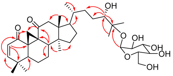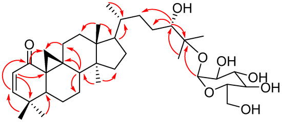 The chemical shifts of the glucose unit are identical to compound 1. According to the 1H and 13C NMR spectra, compounds 2 and 1 exhibit striking structural similarities with one notable distinction: the absence of a carbonyl group at C-11. This discrepancy has been thoroughly corroborated by the HMBC (Figure 7) and COSY spectra, which showed the correlation between H-19 and H-11, which in turn was connected to C-11 in the HSQC spectrum, indicating the carbonyl group at C-11 in compound 1 has been reduced to a methylene group in compound 2. Thus, the structure of compound 2 was characterised as 24S,25-dihydroxycycloart-2-en-1-one-25-O-β-D-glucopyranoside (lessertioside B).