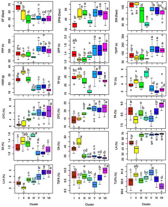 Figure 1 shows the HCA matrix which classified the chickpea accessions into seven clusters. The largest number of accessions was found in cluster V (n = 46) followed by clusters VI (n = 26), VII (n = 17), and I (n = 12). The other clusters including II, III, and IV contained 7, 9, and 5 accessions, respectively. Cluster IV exclusively contained Myanmar accessions. Indian accession dominated cluster VI accounting for 84.62%. Clusters V and VII contained a comparable number of accessions from these two countries, while clusters I, II, and V were the most heterogeneous containing accessions from at least three different countries (Table S1). Landraces dominated cluster IV (100%) while breeding lines dominated cluster VI (84.62%). Likewise, the majority of the cultivars were found in cluster I (n = 8). Statistical analysis showed that all the analyzed phenotypic traits showed significant variations among the different clusters (Figure 2 and Table S3). In summary, accessions in cluster VII showed characteristic features displaying the highest average SPP, crude fiber, dietary fiber, palmitic acid, linolenic acid, and TSFA. These accessions also displayed the second-highest average linoleic acid and the lowest HSW and oleic acid. In contrast, early maturing accessions with the lowest average DM were found in cluster IV and displayed the highest average stearic acid, linoleic acid, and total fat contents. Despite their early maturity, accession in cluster IV exhibited the lowest average PPP, TSPP, and total protein. In general, the HCA classified the chickpea accessions based on the performance of the phenotypic traits.