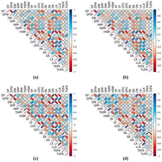 Pearson’s correlation analysis was computed to view the degree of association between the analyzed parameters and some noteworthy correlations were observed supporting the PCA observation (Figure 4). For instance, DF and DM showed a positive and significant correlation (p < 0.001) in the total population (Figure 4a) as well as in the different chickpea genotypes (Figure 4b–d). Similarly, SPP had a positive and significant correlation with PPP (p < 0.01) and TSPP (p < 0.001) regardless of genotype difference. PPP and TSPP also showed a significant correlation with each other across all the chickpea genotypes (p < 0.001). Such positive correlations between yield traits have been reported in previous studies and were used in selecting high-yielding varieties [28,29,30]. On the other hand, HSW showed a positive correlation with total fat, stearic acid, and oleic acid, and a negative correlation with linoleic acid and linolenic acid at different levels of significance across all the chickpea genotypes. DM also showed variable associations with the unsaturated fatty acids at different levels of significance. These observations could signify the effect of maturity period and seed weight on the levels of chickpea fatty acids which could be a research focus in future studies [16]. Crude fiber and dietary fiber also showed a positive and significant correlation with linoleic acid and linolenic acid regardless of genotype difference. The negative and significant association of oleic acid with linoleic acid and linolenic acid in all the chickpea genotypes further asserts the action of FAD enzymes [13,41].