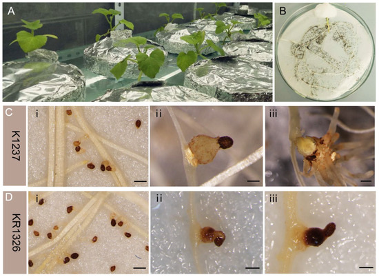 Significant phenotypic differences were also observed in the root chamber method test, where most of the P. aegyptiaca seeds had germinated by 7 dpi (Figure 1Ci,Di). At 14 dpi, P. aegyptiaca had successfully established connections with the vascular system of the “K1237” roots, with expanded nodules, an important feature for successful vascular connection formation with the host (Figure 1(Cii)); however, browning and necrosis of P. aegyptiaca were more readily visible around the “KR1326” roots (Figure 1(Dii)). By 21 dpi, more P. aegyptiaca nodule expansion and cotyledon expansion phenotypes occurred in the P. aegyptiaca–K1237 compatible interaction (Figure 1(Ciii)), in contrast to the complete stagnation of P. aegyptiaca growth on “KR1326” roots (Figure 1(Diii)).