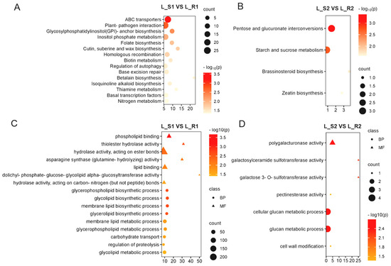The quality assessment and qRT-PCR validation of the transcriptome sequencing results have confirmed the accuracy and reliability of the transcriptome data quality [37]. Further analyses revealed that, in addition to the relatively large number of gene sequence data sets common to each sample, the data set of genes co-specifically expressing L_S2 and L_R2 was also large (Figure S2A). The smallest number of sequence sets was found in L_R1. However, a large number of genes were specifically expressed in L_S1, which was mainly reflected in two parts: the genes up-regulated in P. aegyptiaca in susceptible interactions, especially in the pre-attachment stage; and the genes up-regulated in P. aegyptiaca in the post-attachment period, especially the genes co-expressed in the resistance/susceptibility interactions (Figure S2A). These results provide important direction for subsequent analyses. The exact number of DECs can be seen in Figure S2B.