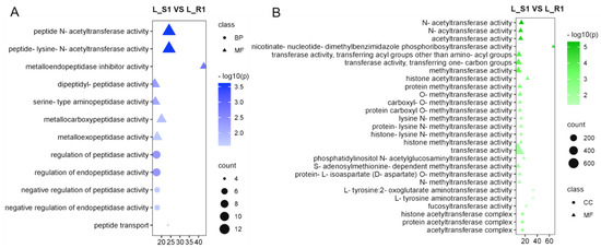 Further analysis of P. aegyptiaca’s DEGs in the susceptible interaction at 9 dpi revealed that many of the GO terms enriched were related to peptidase and transferase activities. The terms enriched for peptidase activity (Figure 3A) included seven MF terms, which were related to acetyltransferase activity and peptidase activity, and five BP terms, which were related to the regulation of peptidase activity. GO terms enriched for transferase activity (Figure 3B) contained 24 MF terms and 3 CC terms related to acyltransferases, methyltransferases, aminotransferases, and other transferase classes. The abundance of peptidase activity and transferase activity may be indicative of physiological and biochemical responses specific to P. aegyptiaca during host invasion, such as the regulation of host immune responses.