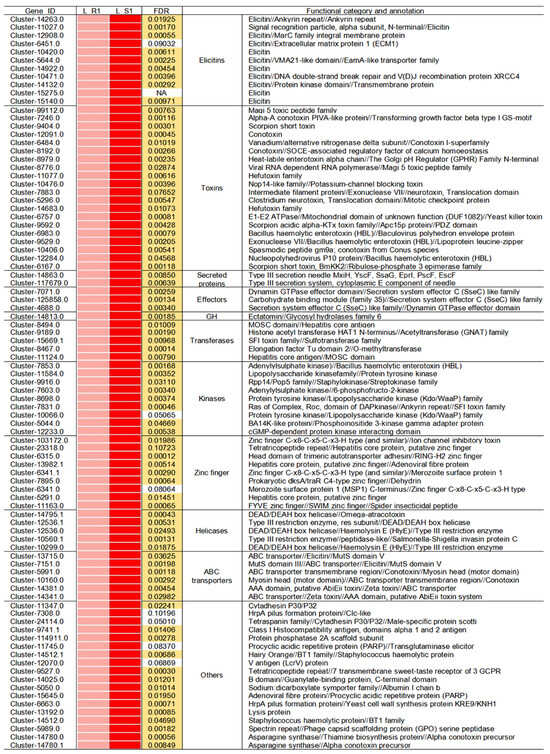 It was initially determined that the pre-attachment period was a critical period for P. aegyptiaca parasitism, so the DEGs were further analyzed. It was found that the up-regulated genes of P. aegyptiaca interacting with “K1237” were enriched into the pathogenesis pathway (Figure 4), and the functional annotation results found that 11 genes were annotated to Elicitin and 20 genes were annotated to Toxin. Two genes were annotated to the Type III secretion system; three genes were annotated to the Secretion system effector C-like family; one gene was annotated to Glycosyl hydrolases family 6; five genes were annotated to Transferase; nine genes were annotated to Kinase; nine genes were annotated to Zinc finger; five genes were annotated to Helicase; six genes were annotated to ABC transporter. Genes were annotated to ABC transporter and 18 genes were annotated to other functional information.