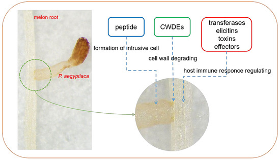 Based on the results of the comparative analysis of the P. aegyptiaca transcriptome, it was hypothesized that peptidases are involved in the formation of invading cells, CWDEs are involved in the modification and degradation of the melon cell wall to facilitate the invasion, and transferases, excitins, and effectors, among others, are involved in the immune modulation of the host melon to ensure successful establishment of the parasitism relationship (Figure 5).
