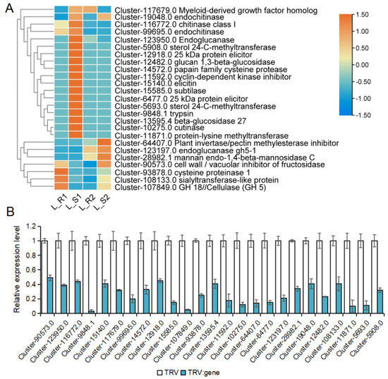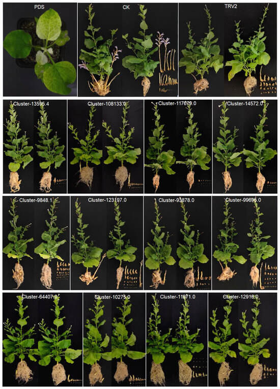N. benthamiana seedlings injected with TRV: PDS would develop albinism in new leaves at around 7 days (Figure 7). Root washing of P. aegyptiaca-inoculated N. benthamiana plants two months later showed that P. aegyptiaca parasitism on some N. benthamiana plants expressing the TRV: gene was significantly reduced compared to the positive control “TRV2”, including silencing Cluster-90573.0, Cluster-6477.0, Cluster-123950.0, Cluster-15140.0, Cluster-12918.0, Cluster-11592.0, Cluster-107849.0, Cluster-19048.0, and Cluster-12482.0 genes of transformed N. benthamiana (Figure 7 and Figure 8A). Further, the number of P. aegyptiaca parasitized in the root system of N. benthamiana was counted and analyzed, and it was found that the P. aegyptiaca parasitism of N. benthamiana plants silenced with genes Cluster-107849.0, Cluster-11592.0, and Cluster-12482.0 differed significantly from control plants (Figure 8B), especially plants expressing TRV: Cluster-107849.0 (Figure S4). Among these, Cluster-107849.0 encodes a cellulase-like hydrolase with hydrolase activity, Cluster-11592.0 encodes a periodic-dependent kinase inhibitor with phosphoprotein phosphatase activity, and Cluster-12482.0 encodes a glucan 1,3-β-glucosidase with hydrolase activity.