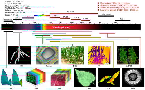 - X-ray computed tomography (X-ray CT). This has a wavelength range of 10 pm–10 nm. It is used to detect the differences in energy absorption before and after scanning from different angles to visualize the external and internal three-dimensional (3D) structures of plants [18].
