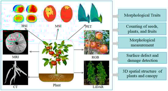 Other spectroscopic techniques also have many applications. RGB is mainly used for pests and disease detection and identification, as well as quality evaluation and grading [26]. MRI is mainly used for detecting plants’ germination ability, dormancy, survival, vitality, and pest infestation [100], as well as the water status and transportation in plant cells [99]. X-ray CT is mainly used for quantifying the degree of drought or salt stress and detecting germination ability, dormancy, survival, vitality, and pest infestation [115,116].