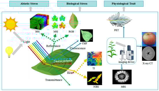 The scattering and reflection, transmission, and absorption of photons are caused by the interaction between light and plant tissues involved in the propagation of light in plants. The spectral technique has been widely used in the phenotype analysis of crops, and sensors with different characteristics have different specific applications in agriculture [58,85,86,87]. Spectral data collection relies heavily on these sensors and affects the final phenotype results [88]. Different spectral imaging techniques can monitor changes in substances on different scales. PET and X-ray CT are used to detect the energy released by electron transitions in the inner shells of atoms. RGB and ChlF capture the energy changes caused by atomic valence electron transitions. HSI and MSI respond to energy changes caused by atomic electron and molecular vibrational transitions. TI, Raman, and MRI respond to molecular vibrational transitions. LiDAR generates precise 3D shapes by measuring variable distances (ranges) using laser pulses. NMR collects only spatial information, while infrared and Raman collect only spectral information [13]. The following system summarizes the application of spectral imaging techniques to plant phenotypes.