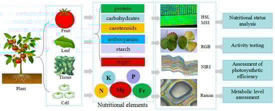 Raman is a scattering spectrum that exposes a sample to the spectrum and measures the degree of light scattering caused by molecular bond vibrational transitions. It is commonly used in molecular structure research. As a non-invasive technique, it is popularly used in biochemical and structural analyses, which provide insights into the structure, concentration, and interaction of biochemical molecules within an organism’s cells and tissues [119,120]. Raman is mainly used for the analysis of plant biochemistry and structure; the detection of biochemical molecules, cells, and tissues [121]; the assessment of plants’ nutritional content [122]; and disease detection [123,124].