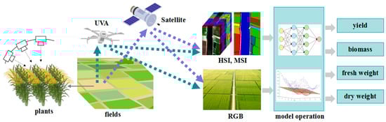 Outdoor HTPP is typically conducted on farms or in natural ecosystems using only natural light sources. Spectral sensing equipment is always installed in agricultural machinery, drones, fixed-wing aircraft, vehicles, and satellites for large-scale phenotype analysis. Aerial platforms provide remote sensing techniques for monitoring crop growth and various stresses and estimating large-scale crop yields [110]. In recent years, the HTPP for unmanned aerial vehicles equipped with multiple sensors has provided a large-scale, efficient, non-invasive, flexible, and low-cost solution for large-scale breeding [50,129,130]. It still faces many challenges, such as cross-platform data acquisition, sensor calibration, data processing methods [131], image interpretation, and the reliable and accurate extraction of crop phenotype information [132].