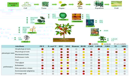 Crop phenotype analysis can be divided into different scale levels: cell and tissue level, organ level (root, stem, leaf, flower, fruit, seed, and harvest), plant level, and population and plot level. X-ray CT and MRI can provide anatomical details of crop tissues, while Raman can visualize cell walls, requiring the use of magnified images, such as microscopes. ChlF is used to examine the function and nutritional information of seeds. NIR effectively evaluates the internal quality attributes of fruits in a non-contact manner. LiDAR can show the 3D spatial structure of leaves and plants. The MSI phenotype has potential in the genetic analysis of seasonal leaf color changes in green crops [92]. HSI, MSI, and RGB are suitable for large-scale, high-throughput crop phenotype analysis that can be combined with agricultural machinery, drones, satellites, and other devices.