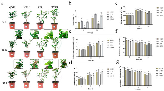 Phenotypic observation and results of the physiological index test. (a) Leaf burn in four C. japonica cultivars. (b) Ratio of leaf burn. (c) Relative electric conductivity. (d) MDA content. (e) SOD activity. (f) Relative water content (RWC). (g) Chlorophyll content. QXH: “Qixinhong”; XTH: “Xiaotaohong”; ZPL: “Zhuapolian”; SBXS: “Shibaxueshi”. The uppercase letters in the figure indicate significant differences among the same cultivars at different treatment times, while the lowercase letters indicate significant differences among the four C. japonica cultivars in the group at the same time.