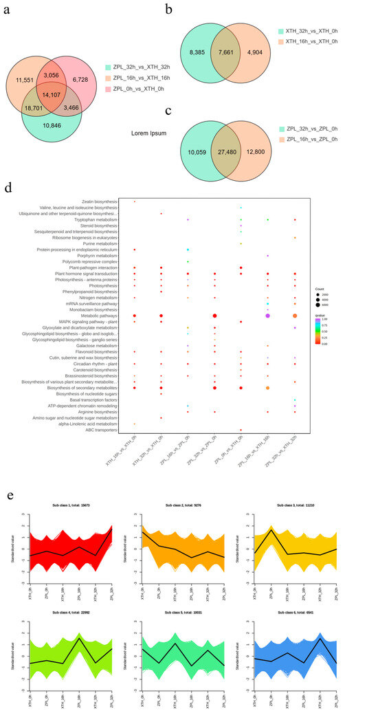 A total of 68,455 DEGs were identified in the two cultivars at the three treatment times points. At 0 h, there were 27,357 DEGs, with 15,463 upregulated and 11,894 downregulated. At 16 h, the number of DEGs rose to 47,415, including 27,702 upregulated and 19,713 downregulated. At 32 h, there were 47,120 DEGs, with 27,798 upregulated and 19,322 downregulated (Figure 1a). An internal comparison showed that at 16 h, “Xiaotaohong” had 12,565 DEGs, including 7043 upregulated and 5522 downregulated. At 32 h, “Xiaotaohong” had 16,046 DEGs, with 8996 upregulated and 7050 downregulated (Figure 1b). In “Zhuapolian”, there were 40,280 DEGs at 16 h and 37,539 at 32 h. Of these, 22,148 and 21,393 were upregulated, while 18,132 and 16,146 were downregulated, respectively (Figure 1c).
