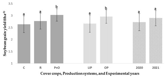 Average soybean grain yield (t ha−1) for two-year trials using different CCs and production systems. C—control; R—rye; P + O—peas and oats; LIP—low-input production; OP—organic production; 2020 and 2021—experimental years. Error bars show standard deviation, and letters on top of error bars indicate no significant difference at p < 0.05 using Tukey’s HSD test.