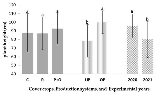 Average soybean plant height (cm) for two-year trials using different CCs and production systems. C—control; R—rye; P + O—peas and oats; LIP—low-input production; OP—organic production; 2020 and 2021—experimental years. Error bars show standard deviation, and letters on top of error bars indicate no significant difference at p < 0.05 using Tukey’s HSD test.