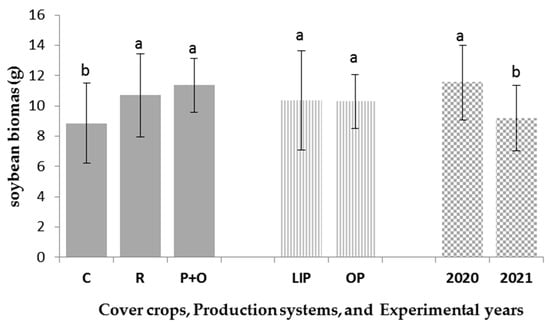 Average soybean plant biomass (g) for two-year trials using different CCs and production systems. C—control; R—rye; P + O—peas and oats; LIP—low-input production; OP—organic production; 2020 and 2021—experimental years. Error bars show standard deviation, and letters on top of error bars indicate no significant difference at p < 0.05 using Tukey’s HSD test.