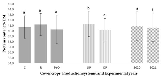 The average protein content of soybean in two-year trials using different CCs and production systems. C—control; R—rye; P + O—peas and oats; LIP—low-input production; OP—organic production; 2020 and 2021—experimental years. Error bars show standard deviation, and letters on top of error bars indicate no significant difference at p < 0.05 using Tukey’s HSD test.
