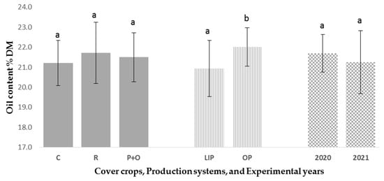Average oil content of soybean in two-year trials using different CCs and production systems. C—control; R—rye; P + O—peas and oats; LIP—low-input production; OP—organic production; 2020 and 2021—experimental years. Error bars show standard deviation, and letters on top of error bars indicate no significant difference at p < 0.05 of Tukey’s HSD test.