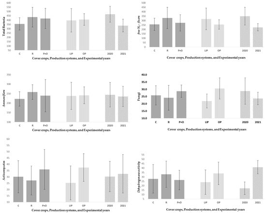 CCs also positively affect the soil microbial community structure and microbial properties and processes [], which was confirmed in this study (Table 3). Our results indicate a significant increase in the abundance of ammonifiers and free N2-fixing bacteria in CC treatments in succession to soybean compared to the control, depending on the production system and the selected CC (Figure 6, Table 4).