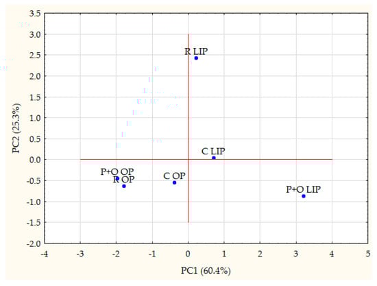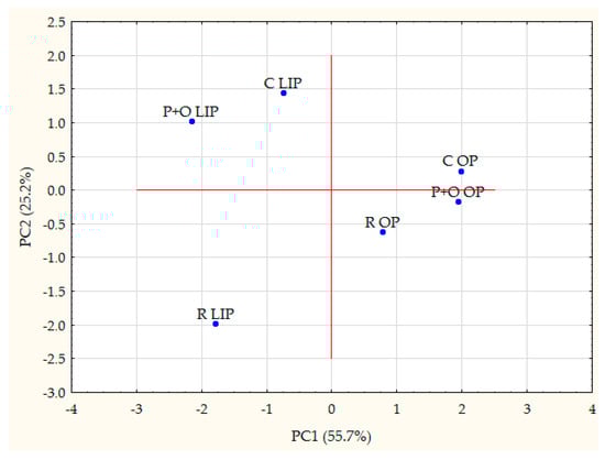 Principal component analysis (PCA) for the effects of different cover crops and production systems on the rhizosphere microorganisms in the first year (2020). C LIP—control in low-input production; C OP—control in organic production; R LIP—rye in low-input production; R OP—rye in organic production; P + O LIP—peas and oats in low-input production; P + O OP—peas and oats in organic production.