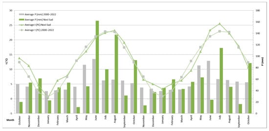 Average temperature (t °C) and precipitation (P mm) during the studied period (October 2019–October 2021) in comparison with the multi-year average (2000–2022).