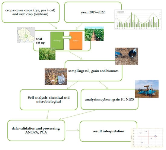 Data processing: The collected data were analyzed in accordance with the experimental design. In the trial, four factors were defined (winter cover crop, production system, soybean variety, and experimental year). The data were statistically processed in R (4.3.2) and (StatSoft Inc., Tulsa, OK, USA) using the analysis of variance (ANOVA) statistical method, followed by mean separation according to Tukey’s HSD test (p < 0.05) and principal component analysis (PCA).